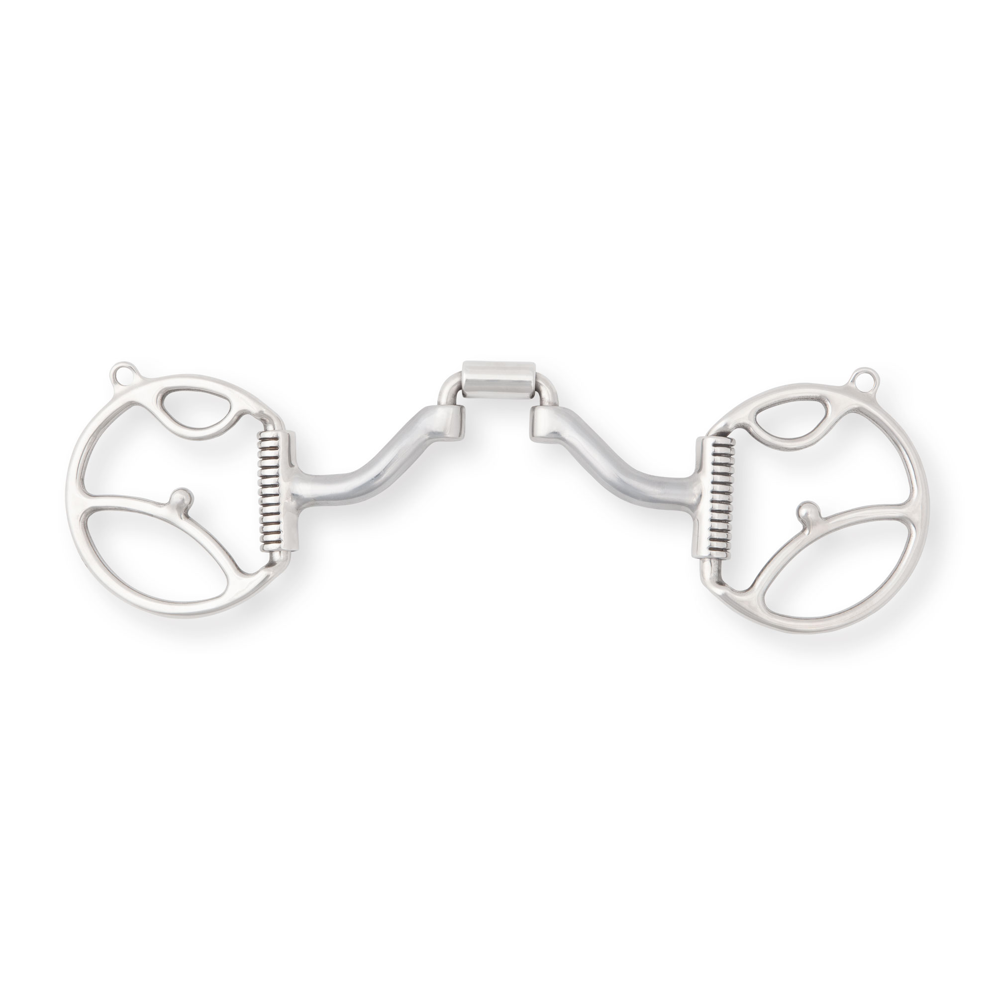 Notes: For the same tongue relief, see the MB 05; for a non-correctional mouthpiece with the same tongue relief, see the MB 33. For slightly more tongue pressure, see the MB 43LP. For quicker tongue pressure and less tongue relief, see the correctional MB 27PB. The western dee with hooks is a circular stainless steel ring with a fixed attachment of the mouthpiece, with top and bottom rings (“hooks”) for headstall and rein attachment. The small loop behind the top slot accommodates a curb strap (attach with two curb hooks). The top bridle ring will fit standard ⅝" leather found on most headstalls. The bottom rein ring has recently been updated to fit slobber straps up to approximately 1 ¾". The knob on the top of the rein ring is for decoration—it has no function. The hooks make this a much more versatile version of the dee without hooks. Attaching the headstall to the top hook holds the bit in the correct position instead of allowing it to slide around the bridle cheek pieces. Attaching the reins to the rein hooks allow the rider to lift the cheek and use the Independent Side Movement™ of the mouthpiece. Using the hooks does not add leverage but allows the rider to transition from a direct rein action to indirect action without changing the bit. Adding a curb strap (using a Myler curb strap kit) incorporates curb pressure. Curb pressure is recommended for ported mouthpieces.